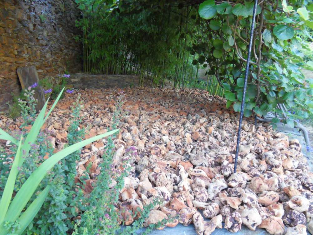 Bildhauer-Bernos Skulpturen aus Heidewurzeln (portugiesisch „Torgas“) weckten das Interesse seiner Hündin ‚Bica‘.