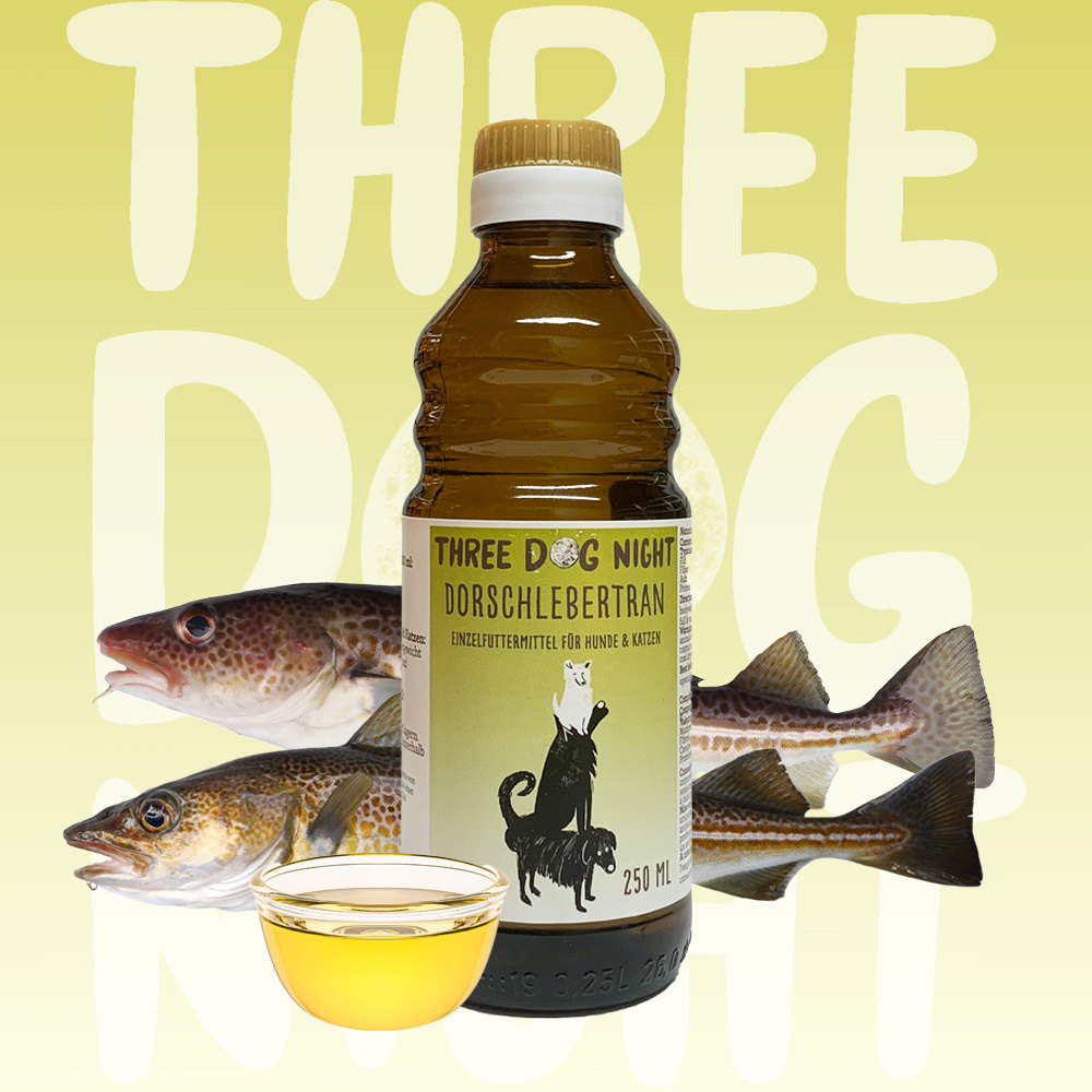 Three Dog Night Dorschlebertran ist besonders wertvoll wegen seines hohen Gehaltes an Omega 3-Fettsäuren, insbesondere die Fettsäuren EPA und DHA sowie natürlichem Vitamin D und Vitamin A. (Vitamin A: 1250 i.E./g; Vitamin D3: 95 i.E./g)