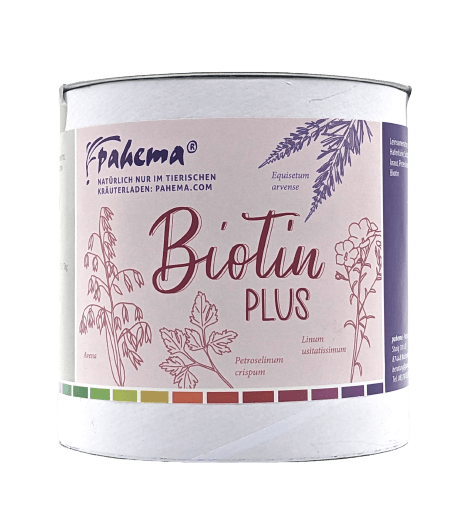Biotin Plus enthält bioverfügbares Biotin (Vitamin H / B7) und kann ernährungsphysiologisch zur Unterstützung bei spröden, rissigen Krallen, aufgerissenen Pfoten, stumpfem Fell, etc. zugefüttert werden.